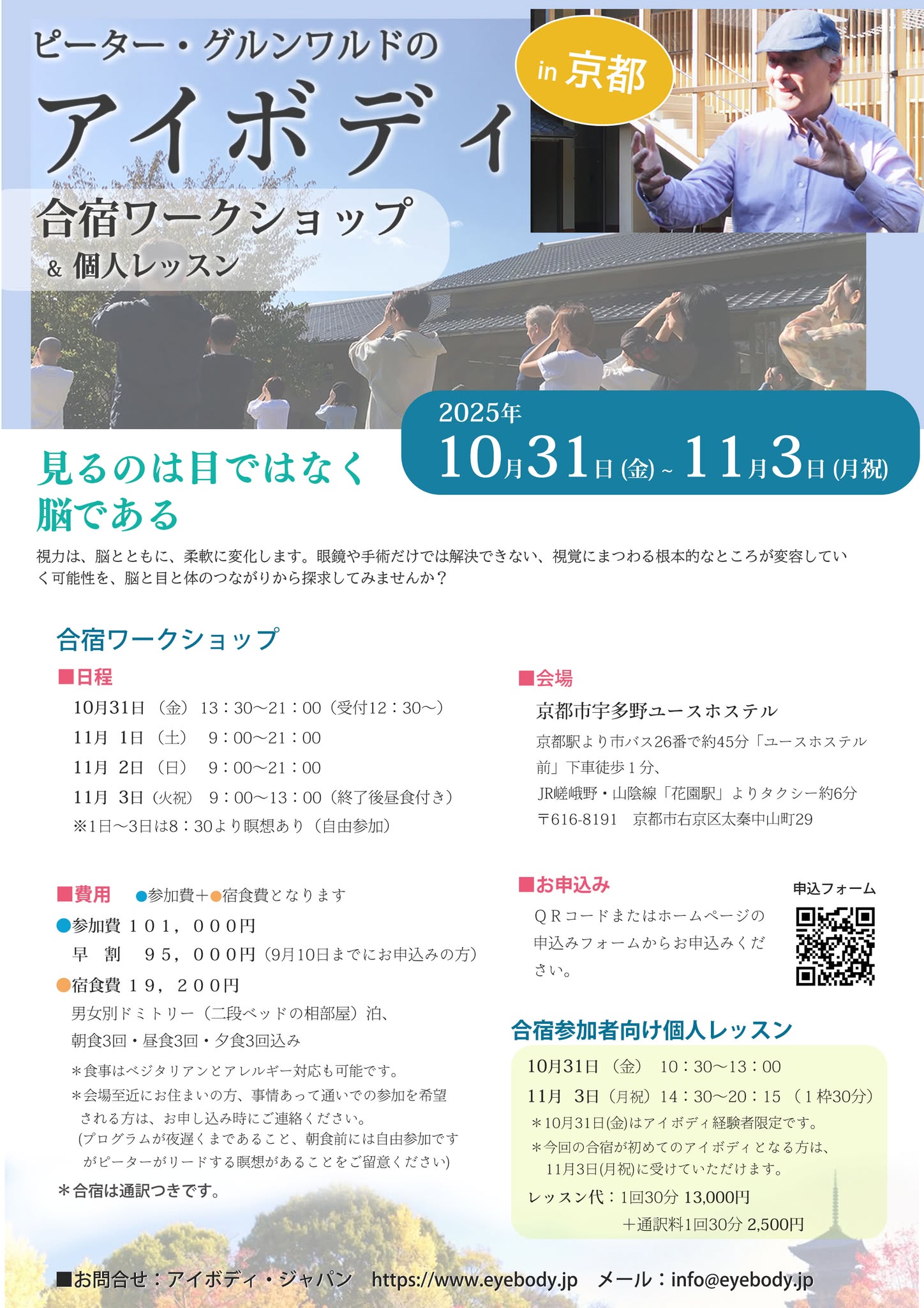 ピーター・グルンワルドの来日合宿ワークショップが今年も開催されます。秋の京都の気持ちよい環境の中、3泊4日をかけて「見ること」にじっくりと向き合う貴重な機会です。アイボディが初めての方も、以前から取り組んできた方も、どうぞご参加ください。
